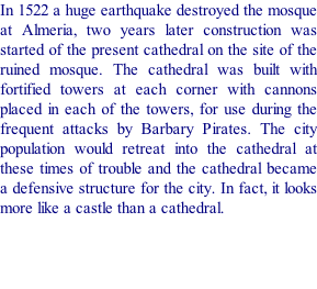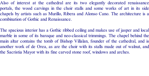 Also of interest at the cathedral are its two elegantly decorated renaissance portals, the wood carvings in the choir stalls and some works of art in its side chapels by artists such as Murillo, Ribera and Alonso Cano. The architecture is a combination of Gothic and Renaissance.